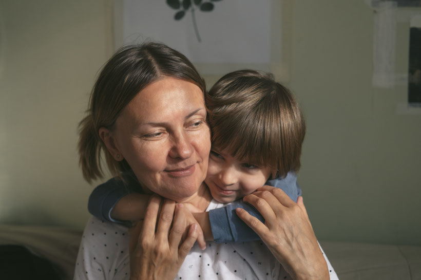 Sophie, 36, sitzt auf dem Sofa, den Sohn Jonas neben sich.
